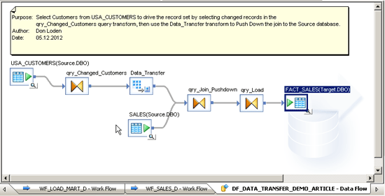 The Data_Transfer transform is useful for performance tuning by increasing pushdown capabilities in SAP Data Services. As mentioned earlier, SAP Data Services strives to distribute the workload across the source and target databases as well as the SAP Data Services’ job server. Data _Transfer transforms increase these options by attempting to push the work down to the source databases. Consider the following example: Sales records need to be extracted as deltas for only changed customers from the source system. With a Data_Transfer, this can easily be accomplished in the same data flow.