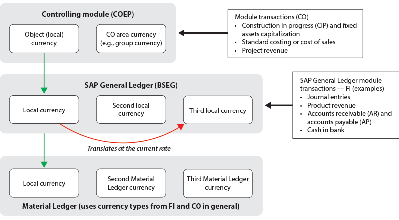 In ECC 6.0, three currency types can be defined in FI but only two currencies can be defined in the CO module as shown in Figure 1. The Material Ledger can be set up with three currencies in line with the currency type defined in FI and CO.