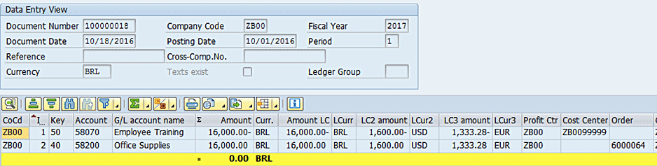 As a first step, actual postings are booked to the internal order as a cost object with two different posting dates. In Figure 2, the first posting is carried out with a posting date of 1Oct 2016. Let us consider that on this date, the exchange rate of BRL – EUR is 0.08333.