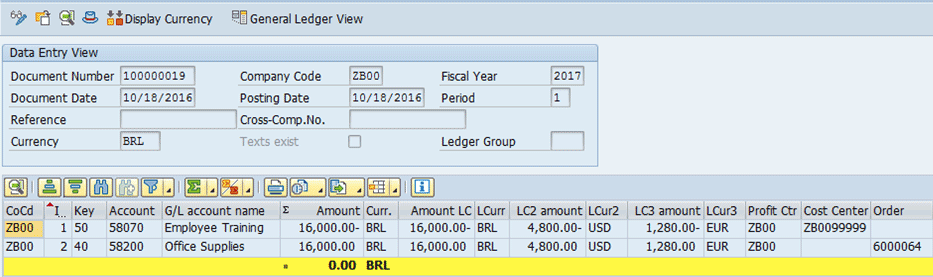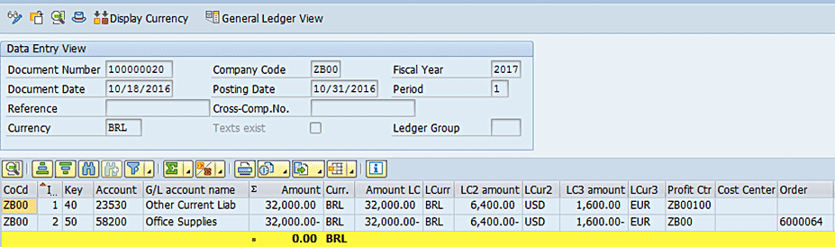 In Figure 3, another expense posting is booked against the internal order with a posting date of 18 Oct 2016. For illustration, the exchange rate of BRL-EUR on this date is 0.08000. Quite similar to posting 1 shown in Figure 2, the functional currency amount is calculated and updated in the LC3 amount.