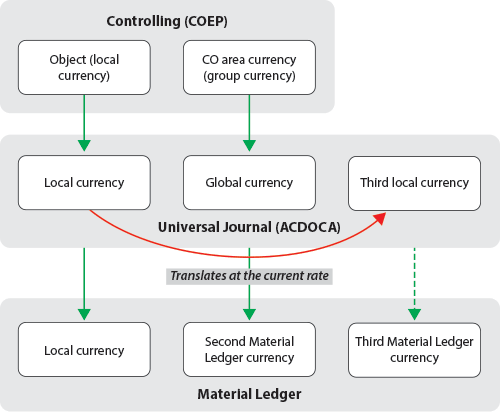 In both the classic General Ledger and the SAP General Ledger, you can define three parallel currencies in FI, two currencies in Controlling (CO), and three parallel currencies in the Material Ledger. With the changing global economic environment, the concept of functional currency has achieved significant importance in addition to local currency (commonly referred to in an SAP system as company code currency) and consolidation (alias group) currency. Many companies have changed operating structures, have expanded internationally, and therefore, transact business in multiple global currencies. The term functional currency comes into relevance based on the currency of the principal economic environment in which the entity operates.