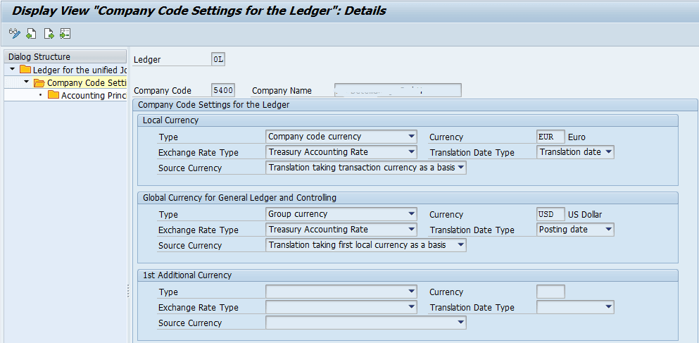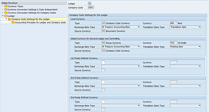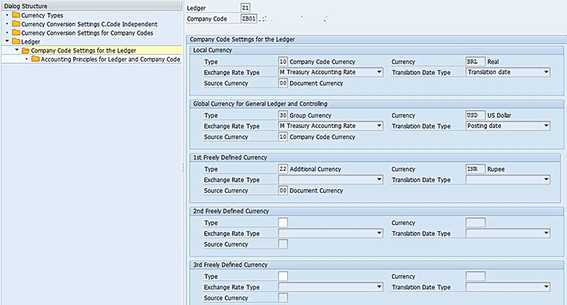 Definition of a custom currency type and assignment to a ledger is carried out by executing transaction code FINSC_LEDGER. This transaction is enhanced to contain additional maintenance views for the definition of currency types and currency conversion settings (company code independent and company code dependent).