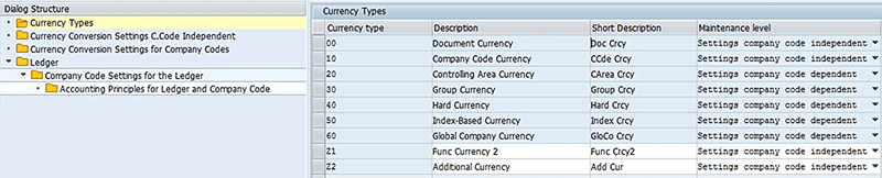 Figure 7 shows a definition of currency type in the customer namespace (Z1 and Z2). Customers can define a custom currency type and define the maintenance level as company code dependent or company code independent.