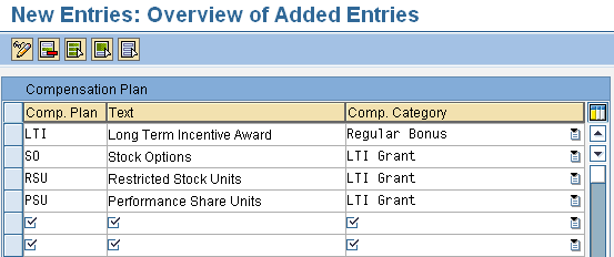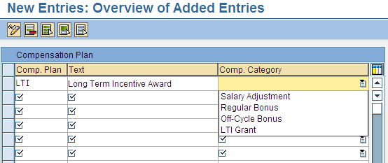 The assignment of the appropriate categories to each plan in this configuration step is critical. Assign the dummy LTI plan to the Regular Bonus category and the other real LTI plans to the LTI Grant category. Assigning the category Regular Bonus in this configuration step enables the system to treat the dummy LTI plan as a monetary plan within the ECM planning and approval iViews. It also enables you to plan LTI grants as currency amounts instead of stock units.