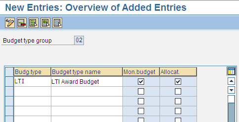 You can create a compensation budget and assign it to the LTI plan if budgeting functionality is needed. Since the dummy LTI plan is used to plan LTI grants as currency amounts and is configured as a monetary plan, the budget used for it should also be configured as a monetary budget (Figure 3). To configure budgets, use transaction SPRO and follow menu path Personnel Management > Enterprise Compensation Management > Budgeting > Define Budget Types.
