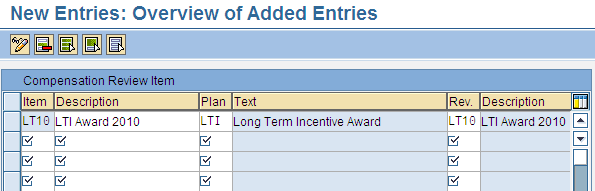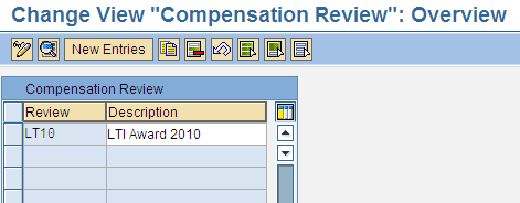 You configure compensation reviews and review items for the dummy LTI plan as shown in Figures 4 and 5. To configure compensation reviews, use transaction SPRO and follow menu path Personnel Management > Enterprise Compensation Management > Compensation Administration > Compensation Plan and Reviews > Define Compensation Reviews. To configure compensation review items, use transaction SPRO and follow menu path Personnel Management > Enterprise Compensation Management > Compensation Administration > Compensation Plan and Reviews > Define Compensation Review Items.