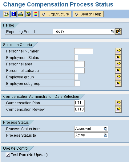 After this BAdI has been coded with the custom logic needed, it is triggered during the activation process when you execute the Change Compensation Process Status transaction as shown in Figure 8. Use transaction PECM_CHANGE_STATUS or follow menu path Human Resources > Personnel Management > Compensation Management > Enterprise Compensation Management > Compensation Administration > Change Compensation Process Status to access this transaction. It then creates the appropriate infotype 0761 records.