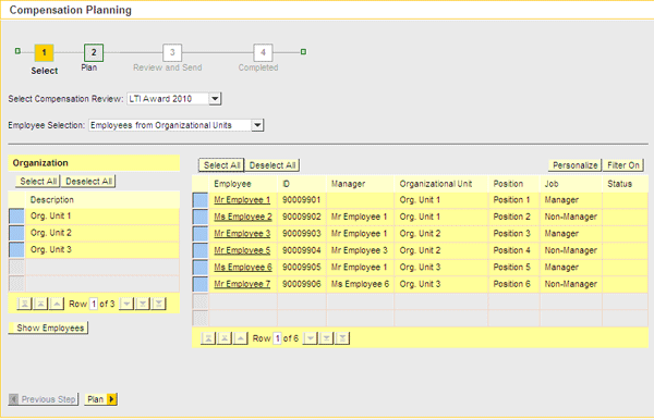 Now let’s take a look at the functionality available for the dummy LTI plan within the compensation planning iView. As shown in Figure 9, the compensation review configured earlier (LTI Award 2010) is displayed as a drop-down choice within the Compensation Planning iView selection screen. To access this screen, log on to the manager self-services portal application and navigate to the link for compensation planning. You can select employees for processing from selected organizational units and initiate planning for them as expected by clicking the Plan button.