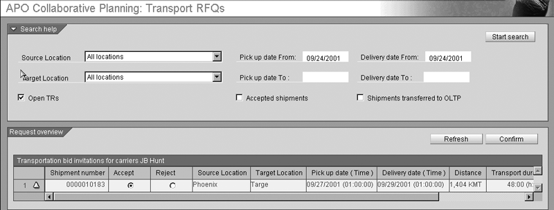 In the screen shown in Figure 10, a carrier reviews its assigned shipments and can