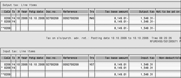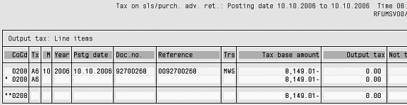 The intercompany invoice is relevant for VAT reporting in both Germany and the Netherlands. When running the standard VAT report (RFUMSV00), the German report picks up the invoice using German tax code A6, and the Dutch report picks up the Dutch tax code Y4 (Figure 13). The system picks up code A6 (Figure 14) for Germany only because the reporting country for this code is DE (Germany), as is shown in Figure 8. Because tax code Y4 has reporting country NL (Netherlands), it is only reported in the Dutch VAT reporting.