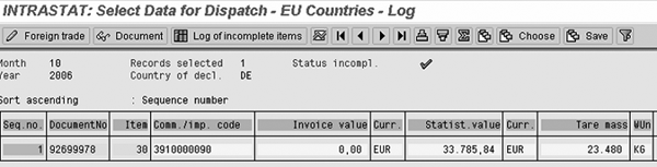 You have to report the intercompany invoice for Intrastat in both Germany (as a dispatch) and the Netherlands (as a receipt). For the Intrastat reporting, you need to run all reports for company code 0208 twice, once for each country. As an example, in Figure 15 you see the selection screen for the incoming goods flows for company code 0208, reporting country NL. You then have to run the same report with reporting country DE.