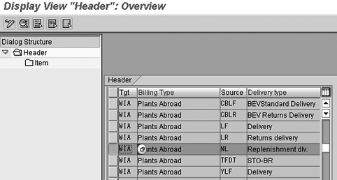 Step 8. Maintain copying control. You can find the settings for copy control by using transaction code VTFL or following menu path Sales and Distribution > Basic Functions > Taxes > Plants Abroad > Maintain Copying Control (Figure 5). In this step, you define the source for the invoice data based on the delivery note because you use the invoice for stock transfers. The default SAP setting is shown in Figure 5. When you use your own defined delivery types, you need to adjust these settings accordingly. The default item category is NLN. The details for this item category are shown in Figure 6.