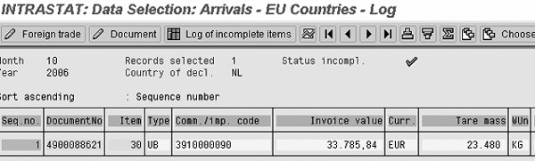 You have to report the intercompany invoice for Intrastat in both Germany (as a dispatch) and the Netherlands (as a receipt). For the Intrastat reporting, you need to run all reports for company code 0208 twice, once for each country. As an example, in Figure 15 you see the selection screen for the incoming goods flows for company code 0208, reporting country NL. You then have to run the same report with reporting country DE.