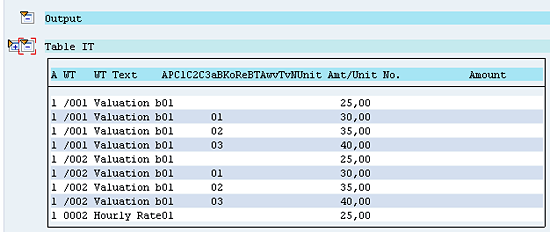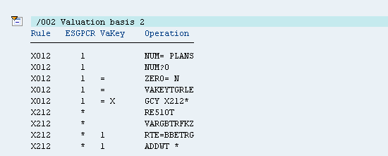 PCR X015 multiplies the number of hours with the hourly rate (as calculated by rule X212) and the valuation base as configured for the wage types in table V_512W_B. Rule X015 then writes the final output (Figure 11). The valuation base in this table for the rate (RTE) field (GVPRO) determines at what percentage a wage type is to be paid (e.g., 100 percent or 150 percent).