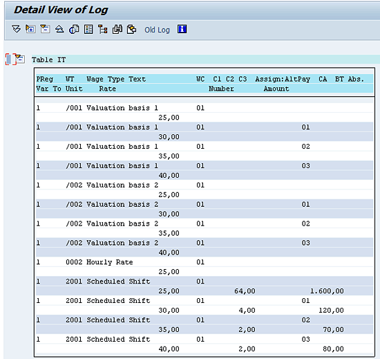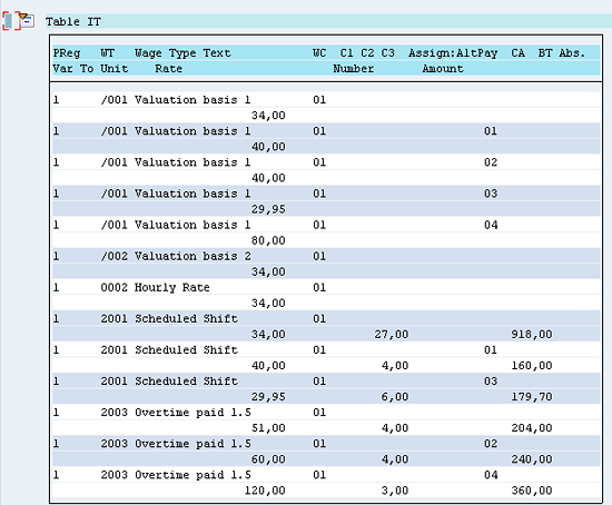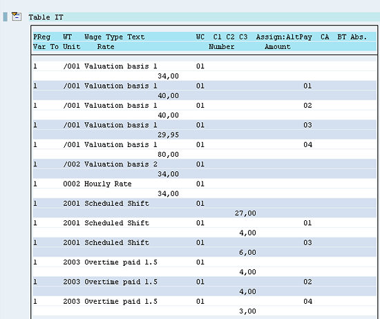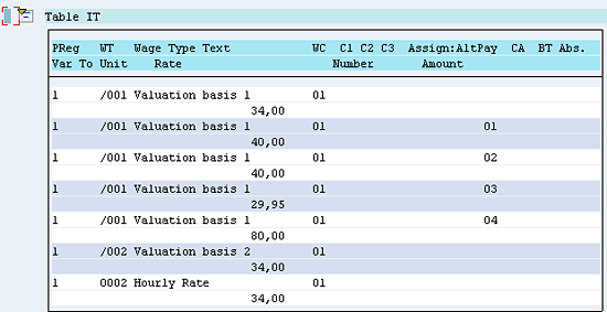 The primary hourly rate from infotype 0008 is also stored in the form of valuation bases /001 and /002 (Figure 30). The valuation bases without an Assign: AltPay Amount indicator assigned to them (Figure 30) are the primary hourly rates from infotype 0008. All the time wage types without a table ALP indicator are paid at this rate.