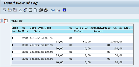 The time wage types and the ALP indicators in the time evaluation results are shown in Figure 7. The link between the time records (wage types) and the ALP indicators is the AL indicator (Figure 7). The AL column in the table with numeric numbers or alphanumeric numbers indicates that a particular time record has an alternate payment indicator. The records with the AL indicator 00 are paid according to the employee’s primary hourly rate maintained in infotype 0008 (basic pay), as shown in Figure 2.