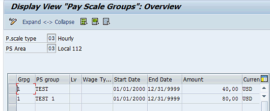 - The hourly rate for the pay-scale data (a combination of the pay-scale type [union], pay-scale area, job name [pay-scale group], and pay-scale levels [grades]) within the same job need to be defined as shown in table V_T510 (Figure 1).