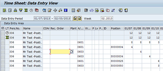 The position details on the time records can be recorded via a time sheet or directly in the time management infotypes. The time data also can be captured using third-party tools and can be interfaced with the SAP system. The example in Figure 21 is done using CATS.
