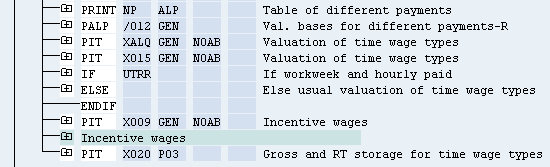 Standard function PALP, in the subschema XT00 of payroll schema X000, imports the ALP table. PCRs XALP and XALQ read each time wage type (record) that has an ALP (premium) indicator on it and derives the premium amount from table T510P. They then add this amount to the hourly rate (Figure 40).