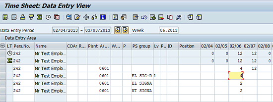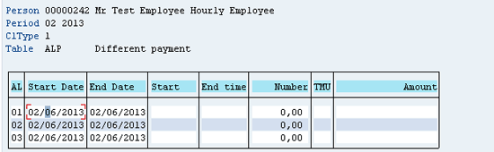 In this example, on a given day (02/06/2013) the employee has worked for 12 hours. Out of these 12 hours he has worked his original job for four hours, another job for the next four hours, and two other different jobs for two hours each. Each job (pay-scale group) has a different hourly rate as per the union agreement. The PS (pay-scale) group name (job) is entered on each time record. If the pay-scale group is not recorded on any time record, then those hours are paid based on the employee’s primary rate as per infotype 0008. When the time (Cross-Application Time Sheet [CATS]) data is transferred, it is transferred to infotype 2002 (Attendances) and 2001(Absences). The pay-scale group on the time records is updated on the transfer from CATS into infotype 2002 on each time record (Figure 4).