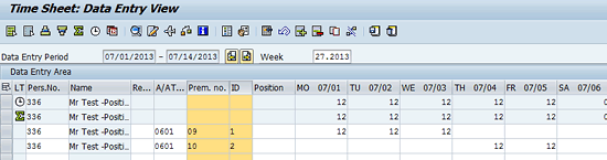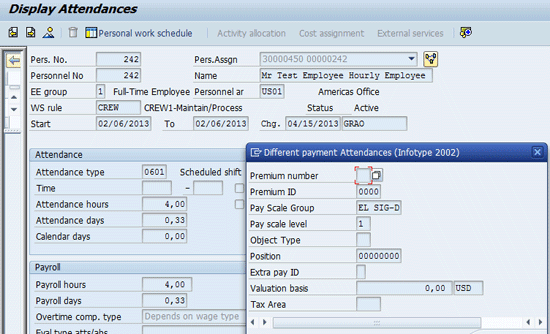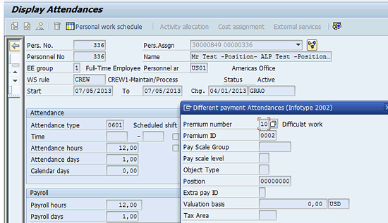Display of premium on time record in infotype 2002 (sample entry)