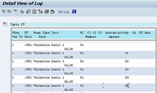 Display of the data in the log for the IT table