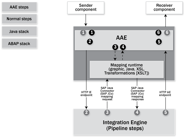 Figure 1 illustrates the message mapping infrastructure. The system processes messages from step 1 after receiving them from the sender component. For scenarios that do not use the Advanced Adapter Engine (AAE), messages enter the pipeline steps in the ABAP Integration Engine via HTTP in step 2. For scenarios that use the AAE, the AAE processes the messages directly in the Java stack in step 2.