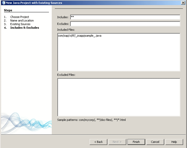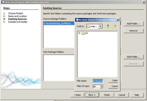 Step 3. Select the source directory in which you have extracted the source code from the message mapping as shown in Figure 11. Click the Add Folder button to browse the source directory as shown in the small window on top. Then click the Open button to view the source code (Figure 12). Click the Finish button to create the project.