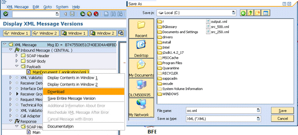 Step 5. Run the mapping program. To do this, you need to obtain the source xml payload, which you can download from transaction SXMB_MONI. You need to place the xml payload in the c: directory with the name src.xml because the mapping program will try to access the payload there during runtime (Figure 16). Open the message from SXMB_MONI and expand the Inbound Message node. Under the Payloads node, right-click the document and select Download to save the xml payload to c:src.xml.