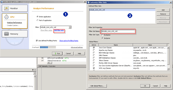 Step 6. Now everything is ready for the profiling. Go back to the NetBeans project window, right-click the file _zsappjsample_, and select Profile File from the context menu to start the profiling. Window 1 appears. In window 1, Click the Edit filter sets link to add the Java core, W3C.org, and XML.org classes as inclusive. Click the OK button after this is done as shown in window 2 (Figure 17).