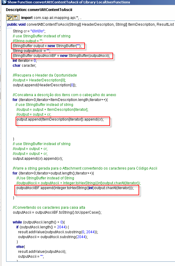 Step 9. Return to the user-defined function convertAttContentToAscii in Enterprise Service Builder. Change the code to use StringBuffer instead of String (Figure 21). Save and activate the change.