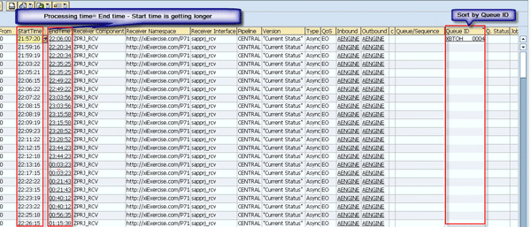 In the result in Figure 3, I sort the messages by start time and the queue ID. Exactly Once (EO) messages are normally processed in parallel with different outbound queues, which is controlled by parameter EO_OUTBOUND_PARALLEL in transaction SXMB_ADM. In this example, messages are processed in the XBTOH___000 through XBTOH___0004 queues. Therefore, checking message processing times by queues makes the most sense.