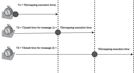 For simplicity, disregard the time spent on other pipeline steps and focus on the message mapping. Provided that message 1 has an execution time (T0) of eight minutes and 10 seconds (490 seconds), the total processing time for message 1 is T1=T0. In an ideal situation, assume the message mapping step costs same amount of time for each message as T0. Message 2 starts as soon as message 1 finishes. Including the waiting time for message 1, the total processing time for message 2 is T2=T1+T0=2*T0. For message 3, the total processing time is T3=T2+T0=3*T0 and so forth (Figure 5).