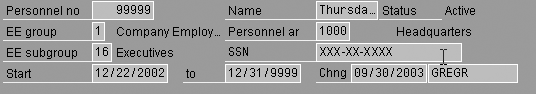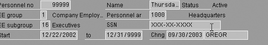 The need rarely arises to change the SSN because most people keep the same number for life. Therefore, you should help protect employees’ PII by eliminating the name and SSN from the header view whenever possible to minimize its exposure to casual viewers. Every person passing by a monitor with the standard display has the potential to note the name and SSN.