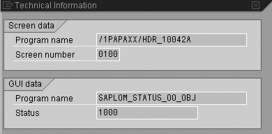 Find the header assigned in the PPOxx screens by selecting one of the fields in the subscreen. Use the F1 key to access the help for that field. Access the technical details for the field. The screen displays the program name; for example, /1PAPAXX/HDR_10042A in Figure 11. The last three characters display the header modifier and transaction class for the screen. In this example, it is header modifier 42 for transaction class A, employee master data. When you have identified the header modifier, you can make changes as described in the steps above, if required.