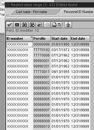 The ID number column consists of SSNs and the PersNo column contains PERNR data. Avoid presenting this information together with the name data in the Last name – First name tab.