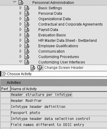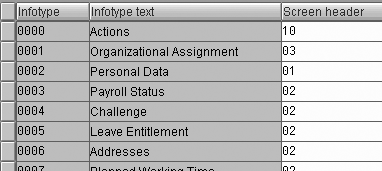 Double-click on the Header structure per infotype node to bring up the header identifiers assigned to the various infotypes. SAP delivers standard header identifier assignments and assigns header ID definitions to specific infotypes or infotype groups. They are standard functionality and you can customize them. Table 1 shows the assignments for the Personnel Administration (PA) infotypes.