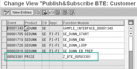 Add event 00503301 and assign the custom function module Z_BTE_00503301 to it