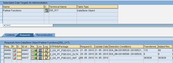 In Figure 11 you can see the first initial load from Z_DS_PF_ PSEUDO_INIT that contained 303626 records, and then you can see how the selection conditions are generated for the InfoPackage Z_DS_PF_PSEUDO_DLTA. The InfoPackage code derives those dates from system tables based on when the last initial load or delta load occured. Then the data-source user exit logic in SAP ECC takes these dates, reads the data from change log tables, and builds the partners on the sales document for both header and line items.