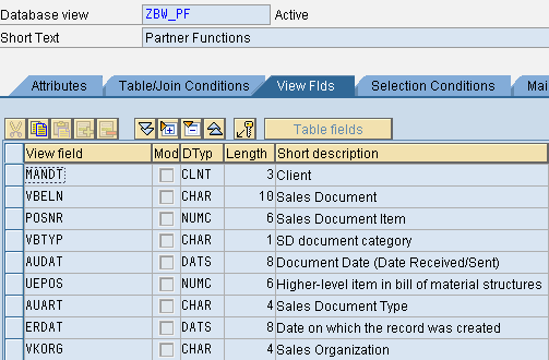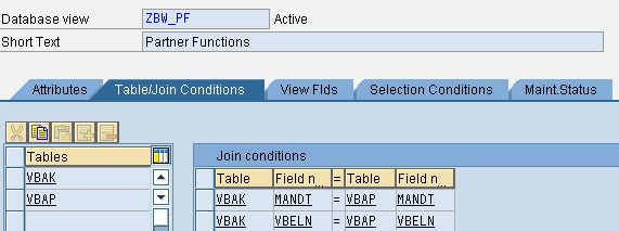 Create a database view called ZBW_PF containing sales document header VBAK and line table VBAP in SAP ECC using transaction SE11 (Figure 2). Click the Table/Join Conditions tab to view join conditions. You can’t join partner function table VBPA in this view because not all the sales document lines have partner functions. In these cases, SAP ECC replaces the line item partner functions from the header partner functions in the presentation layer. However, there won’t be any partner function records for those respective lines at the database level (table VBPA).