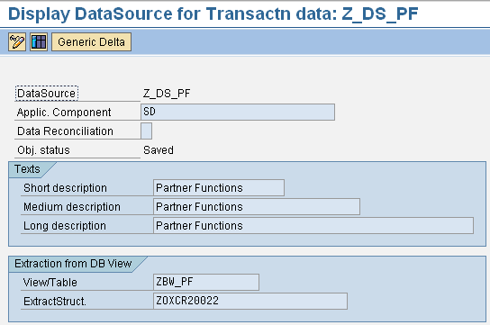 Map data source Z_DS_PF_DLTA to InfoSource Z_IS_PF. Create a transfer rules start routine using the code at this link. At a high level, the code recreates all the partners for the sales document that are changed, created, and deleted.