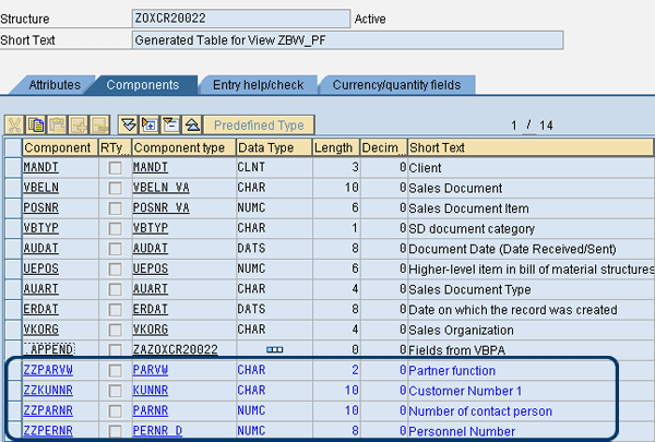 The SAP system automatically generates an extractor structure (in my example, ZOXCR20022). From there, enhance ZOXCR20022 using transaction SE11 to add partner function PARVW, customer KUNNR, number of contact person PARNR, and personal number PERNR (Figure 5).