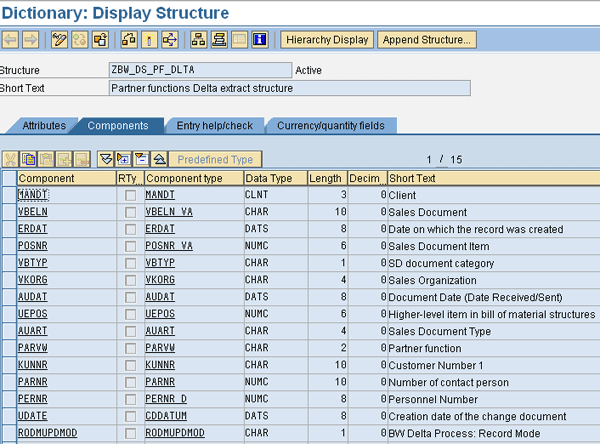 Create structure ZBW_DS_PF_DLTA in SAP ECC using transaction SE11 with the fields you are interested in bringing to SAP NetWeaver BW for partner functions. In my example, I select the fields shown in Figure 8 based on previously described business requirements.