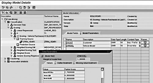 To determine sales points, a standard sales query with customer and car model code in the query rows (with a key figure of quantity purchased) serves as the input/source query. I then define a Scoring model that assigns a certain number of points to each model of car (Figure 2). To handle the requirement for depreciation of points, I create separate queries that filter the sales quantity per model—for example, “sales greater than 12 months old but less than 24 months old.” This filtered query then feeds a second data-mining model (copied from the first) with the same scores assigned per car model, but with a different weight of Scoring model field applied (0.8 rather than 1).