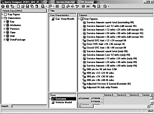 The query to determine service points is more complex (Figure 3). The first key figure (KF1) is the total service dollar amount spent by the customer across all years excluding insurance (IN) jobs. This is for information only. Columns KF2 to KF5 are restricted key figures, breaking out the total dollars spent into each year (last 12 months, greater than 12 months but less than 24 months, and so on) excluding insurance jobs. The Cal. Year/Month filters use standard, system-filled variables with offsets.