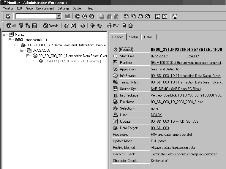 You might need to examine PSA data during your BW development. Debugging update rules using simulation or verifying the raw data received from your source systems are two situations in which you might work directly with PSA data. You can see this PSA data using Administrator Workbench Monitor, shown in Figure 1.