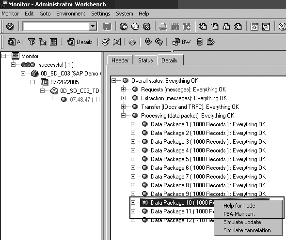 Open your data load in the Administrator Workbench Monitor screen. Choose the Details tab. Open the Processing section of the request details. Since the PSA record that you want to use for debugging is in data package 10, right-click on that data package and choose Simulate Update to begin your simulation (Figure 10).