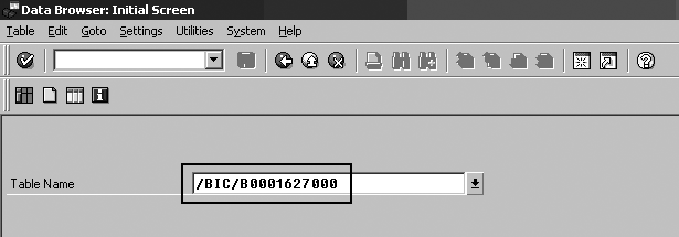 Step 3. View the PSA table. Copy the ODSNAME_TE value (/BIC/B0001627000 in Figure 4) to the clipboard. Execute transaction /nSE16 to get back to the start of the SE16 transaction. This time, paste the PSA table name into the Table Name field of SE16 and press Enter (Figure 5).
