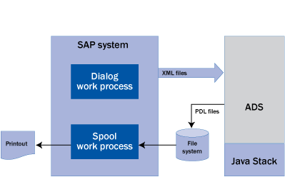 First of all, the creation of the PDL is not performed within a spool work process. Instead, the ADS is used. This component does not run within the SAP kernel, but within the Java Stack of the SAP system. This stack consists of numerous Java services running on the SAP JEE server. This architecture is shown in Figure 2.