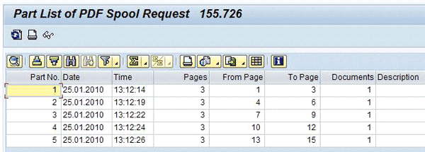 As mentioned, you can append data to spool requests as long as they are not finalized. Spool requests for SAPscript and Smart Forms consist of a single block of data in an SAP internal format. Since SAP Interactive Forms consist of PDL files stored on the file system, each append to a spool request generates a new file. Therefore, SAP Interactive Forms spool requests can consist of a large number of single files independent from each other. These single files are called parts. For SAP Basis releases 6.40, 7.00, and 7.10 the part list is shown first after you click an SAP Interactive Forms spool request in transaction SP01. Figure 4 shows the part list of a SAP Interactive Forms spool request.